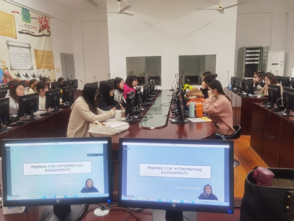 3月3日,口译教学团队邀请资深自由口译员宋晗阳女士参与《英语口译2》的课堂教学。 在课堂上,宋晗阳女士以在线会议的形式,结合多年口译经验与真实的语料,从商务会议主题的信息收集、评估与整理,术语概念表的制作,参会人员信息挖掘等多个方面,为同学们详细讲解了商务会谈中译前准备的要点和步骤。同学们纷纷表示受益良多。
